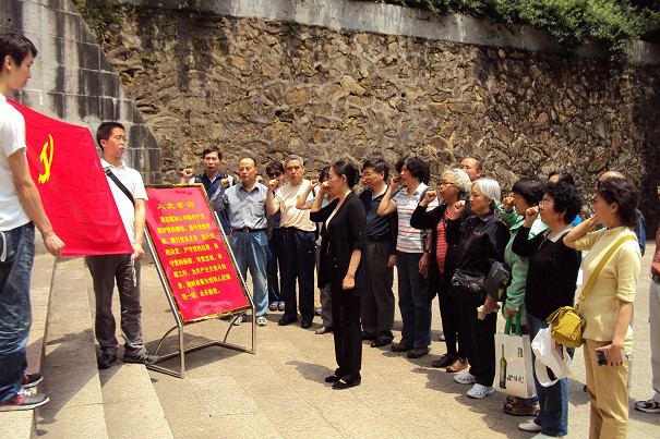 5月21日,学会在职和离退休的党员、干部职工等一行26人经过15个多小时火车的长途旅行,到达了红色革命圣地—井冈山。所有同志,特别是年长的老同志不顾旅途劳顿,以饱满地精神来到了井冈山革命烈士纪念碑下,向为中国人民革命和解放事业英勇献身的烈士们敬献了花圈,表达了哀思;两位青年同志手擎花圈走在最前面,学会党员及职工在学会党支部书记、副理事长兼秘书长李少丽的带领下分列左右两排,拾阶而上,来到井冈山革命烈士纪念碑前,献上花圈,全体职工深深鞠躬致意,整个仪式隆重而肃穆。敬献花圈仪式结束后,全体党员整齐划一排列在鲜红的党旗前,坚定地举起右拳,在党支部书记李少丽的领誓下,庄严的入党誓词重温在每位党员激动的心底,沸腾在血液里。离退休老同志们眼含泪花地凝视着党旗,中青年党员和职工目光坚定地凝视着党旗。这一刻只有神圣,只有用生命捍卫誓言不可动摇的决心。李少丽同志讲到,今天我们千里迢迢来到革命圣地井冈山,站在鲜红的党旗下,为了使我们的入党誓言永不变,就要时时刻刻刻想着自己入党宣誓时澎湃的精神和自己对党作出的庄重承诺。希望学会每一位共产党员都应该在党旗下肃然起敬之余,一定要保持奋斗不息的精神,坚定理想信念,忠实践行入党誓词,由此激发出一种奋起而前行的动力,在普通平凡的工作岗位上,始终做一个能坚持发挥先锋模范作用的共产党员。