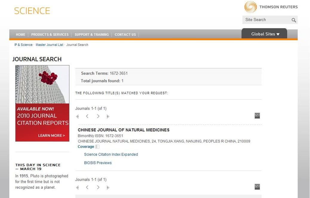 2012年3月19日,接汤森路透公司正式通知,我会主办期刊《中国天然药物》已于日前完成全部评审程序,被SCIE(Science Citation Index Expanded)收录,期刊文章摘要在科学网(Web of Science)上刊登,收录内容从2012年第一期计;期刊全文可在Science Direct数据库进行查阅。刊物同时还被BA(Biological Abstracts)和BP(Biosis Previews)收录。