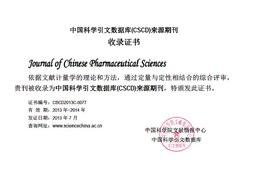 自2010年起改为双月刊后,《中国药学》(英文版)已被美国《化学文摘》(CA),波兰《哥白尼索引》(IC),美国剑桥科学文摘《乌利希期刊指南》(UIPD),英国《国际农业与生物科学研究中心》(CABI),荷兰《文摘与引文数据库》(SCOPUS),《中国体育买球入口_人生就是搏,核心期刊》(中国体育买球入口_人生就是搏,论文统计源期刊),《中国科学引文数据库》(CSCD),《中国期刊全文专题数据库》(CNKI)等收录。2012年被评为“2012中国国际影响力优秀学术期刊”。