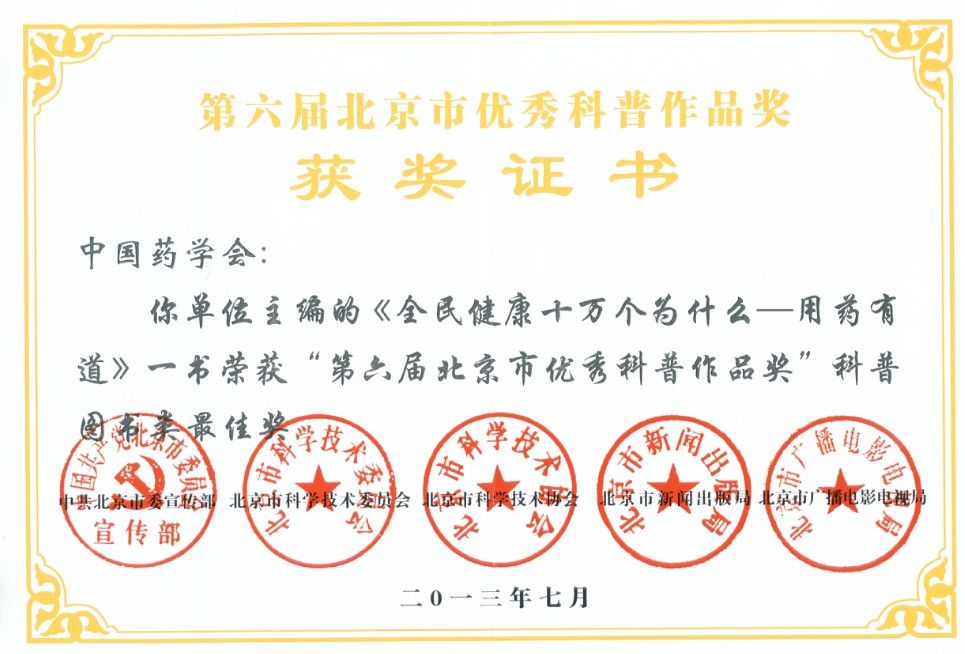 同时,《全民健康十万个为什么—用药有道》一书也荣获由中共北京市委宣传部、北京市科学技术协会、北京市新闻出版局、北京市科学技术委员会、北京市广播电影电视局共同举办的第六届“北京市优秀科普作品奖”科普图书类最佳奖。